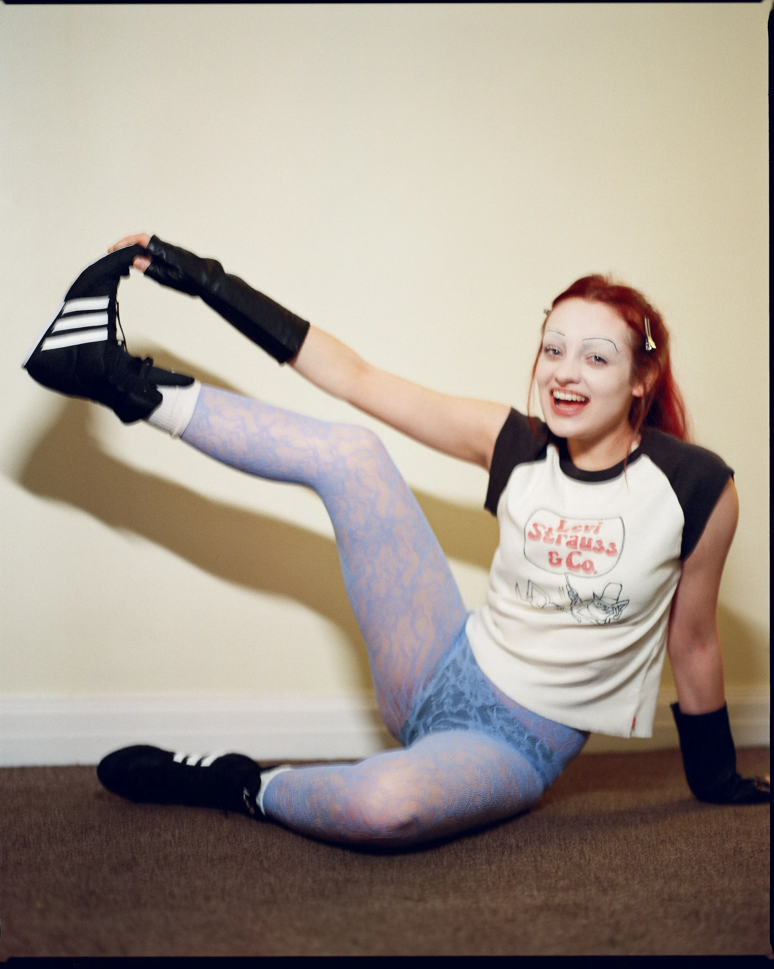 Person wearing a short-sleeve Levi Strauss t-shirt, blue lace leggings, and black athletic shoes with leg raised in a playful pose indoors.