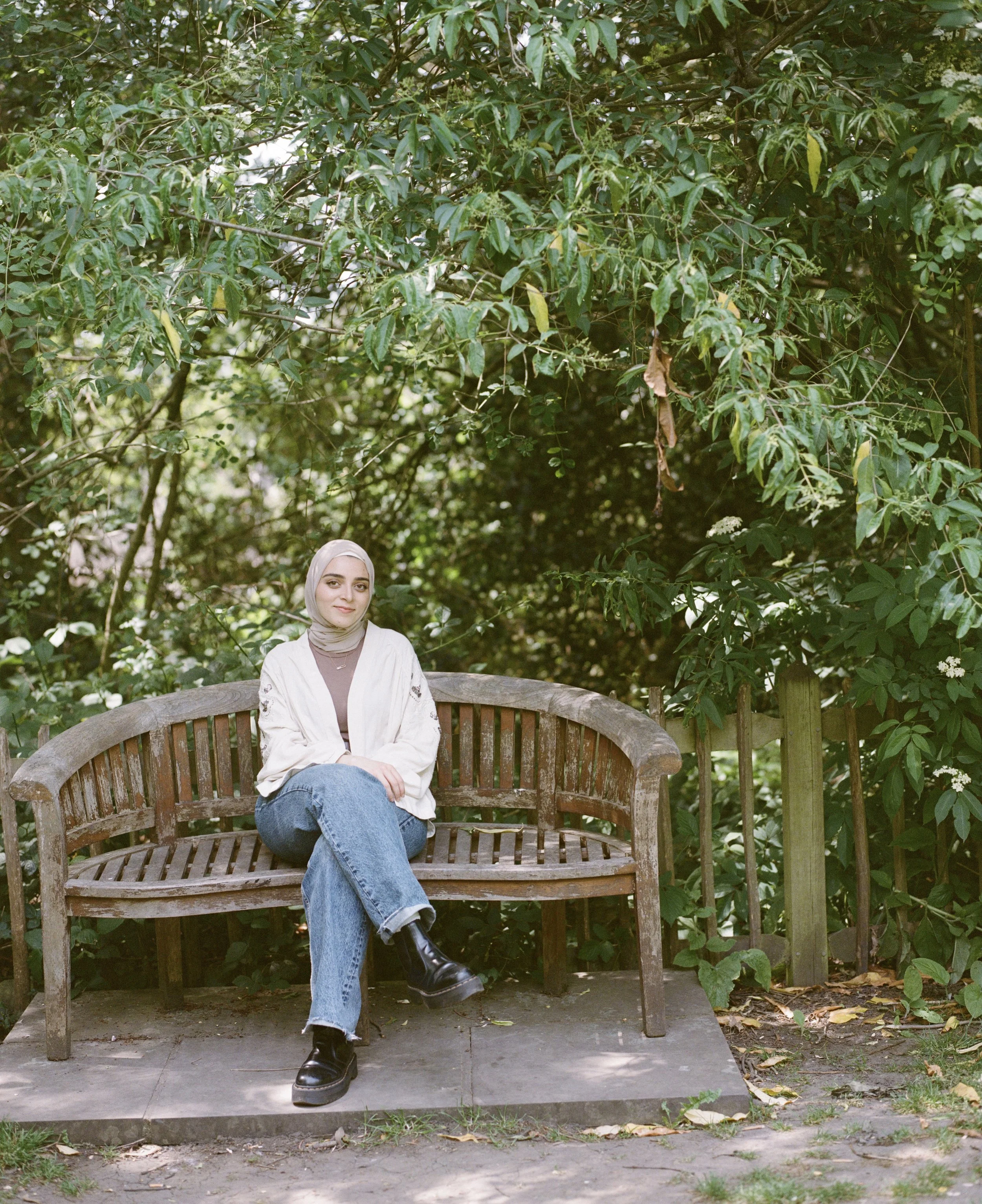 Person wearing a hijab sitting on a wooden bench in a garden setting with lush green foliage.
