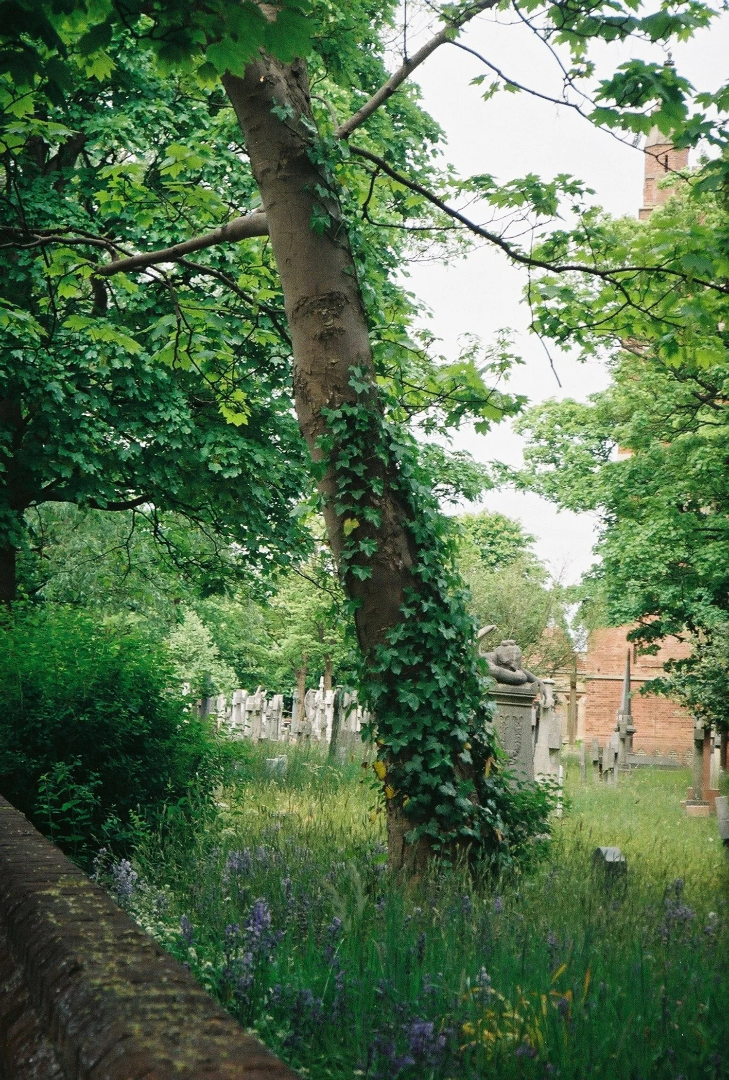Graveyard with tombstones, trees, and ivy-covered trunk