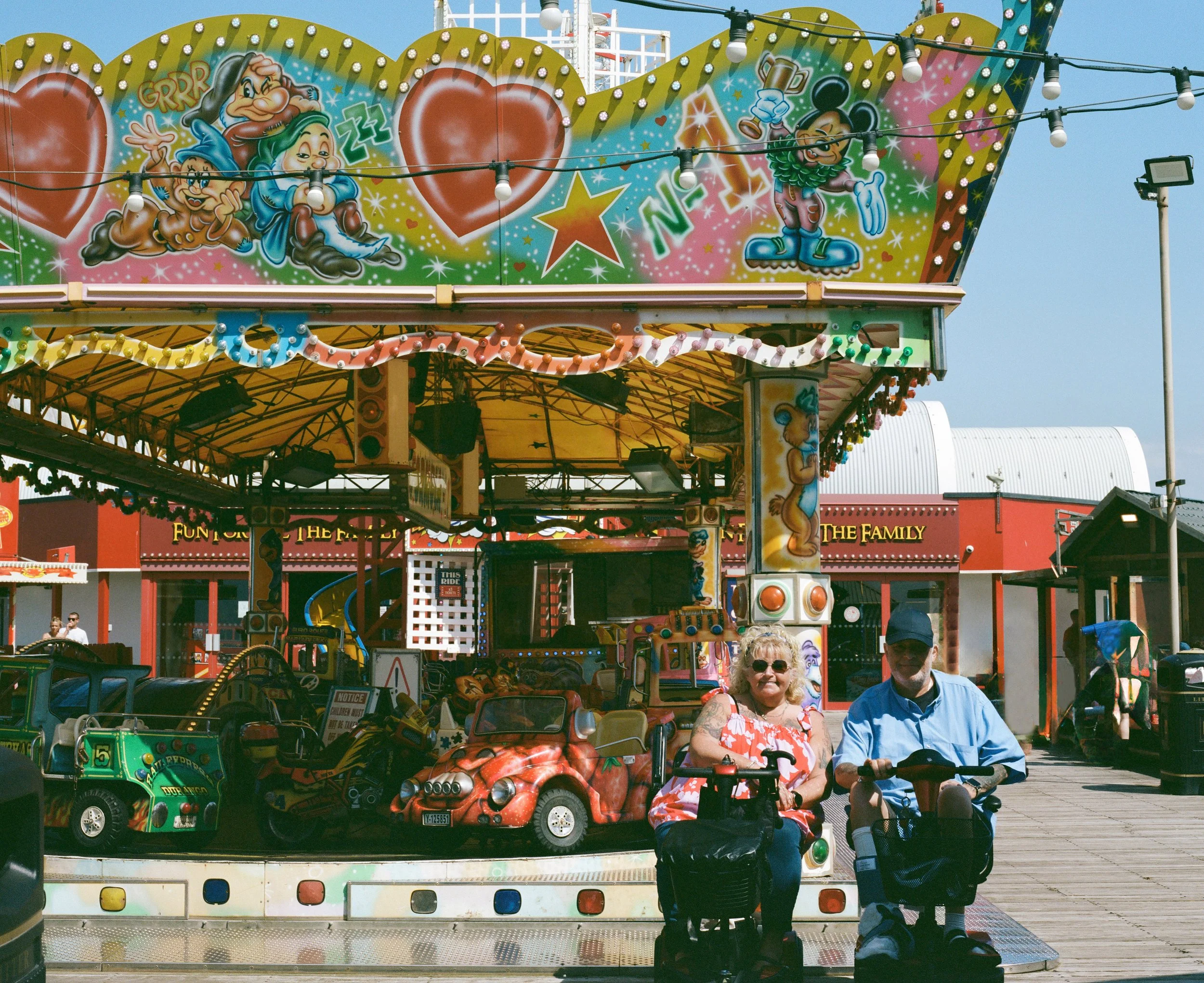 A colorful amusement park ride with cartoon characters on the canopy, including a drawing resembling a famous mouse. Two people on mobility scooters are in the foreground, smiling. The background shows more amusement park attractions.