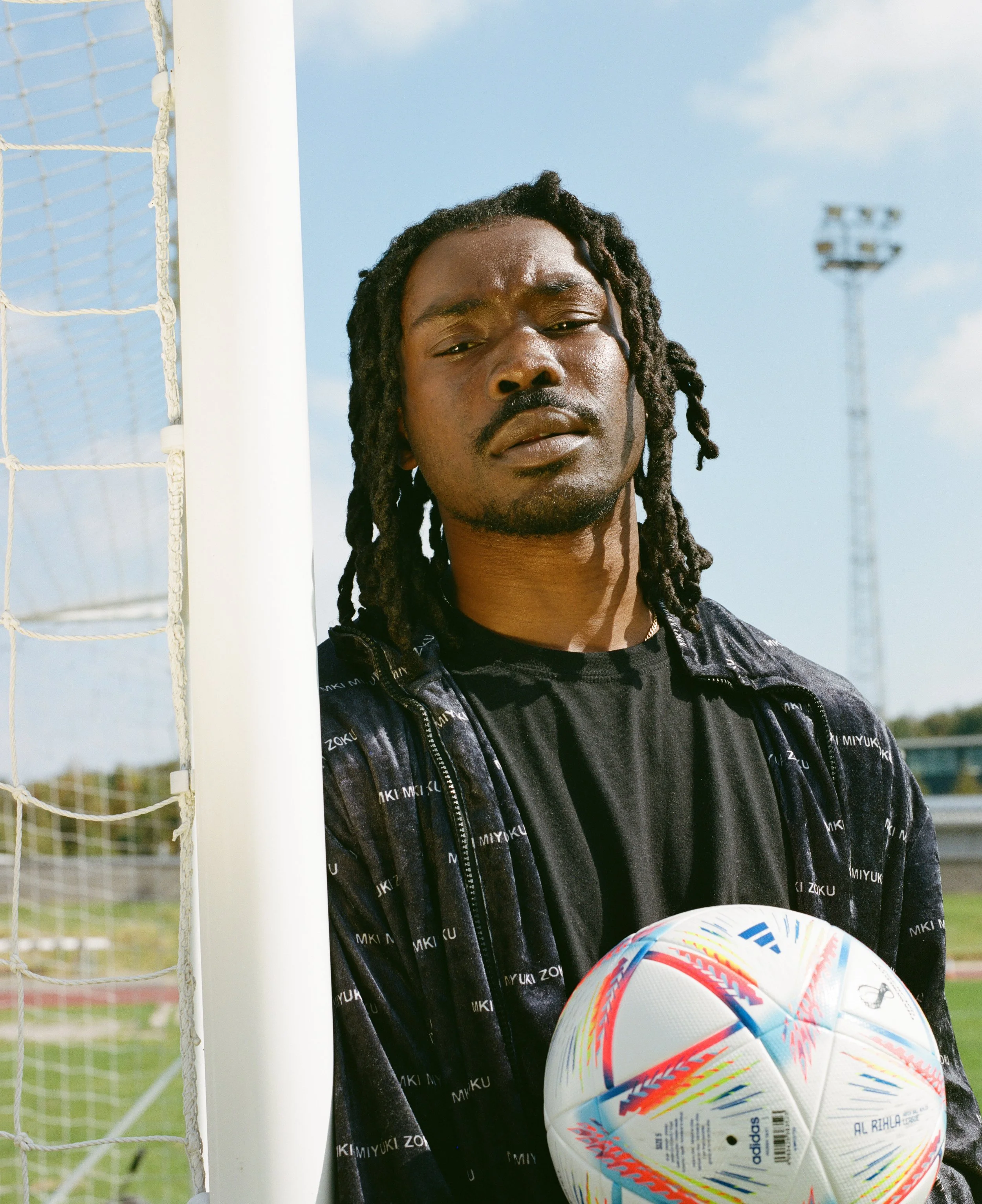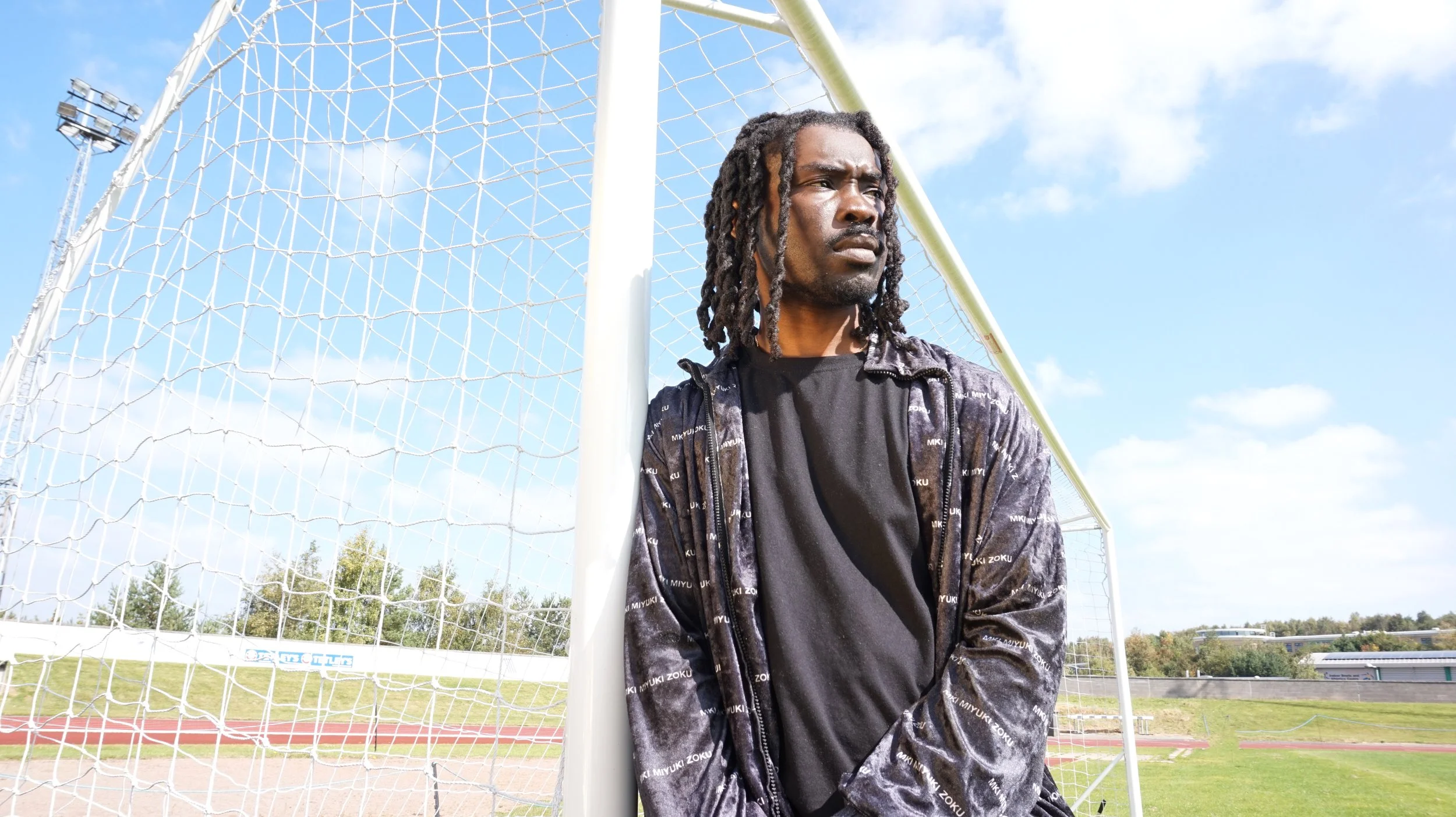 Man with long hair standing next to a soccer goalpost holding a colorful soccer ball, wearing a black jacket. Football field and stadium lights in the background, under a clear blue sky.