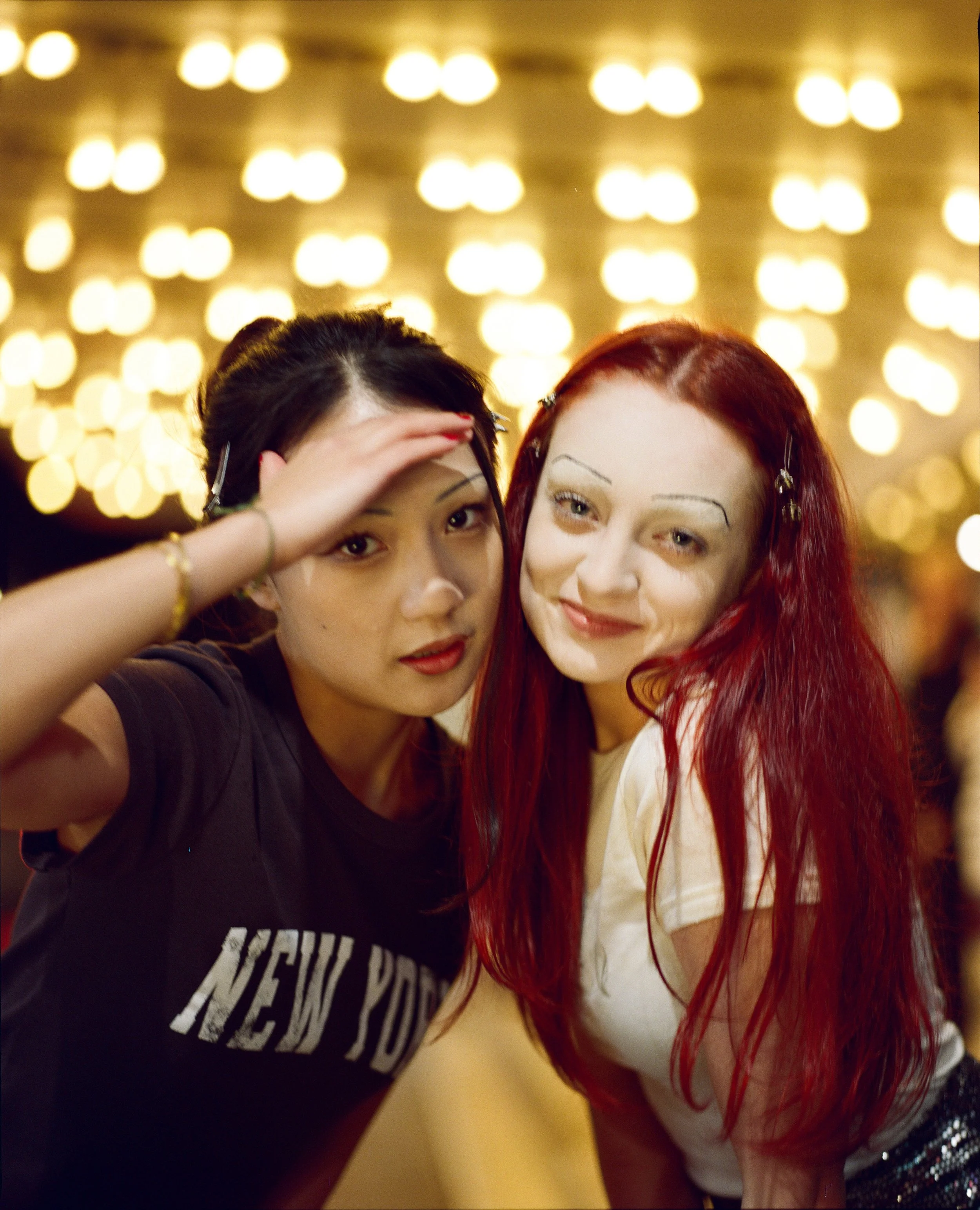 Two people posing in front of blurred lights, one with red hair and wearing a white shirt, the other wearing a 'New York' black t-shirt.