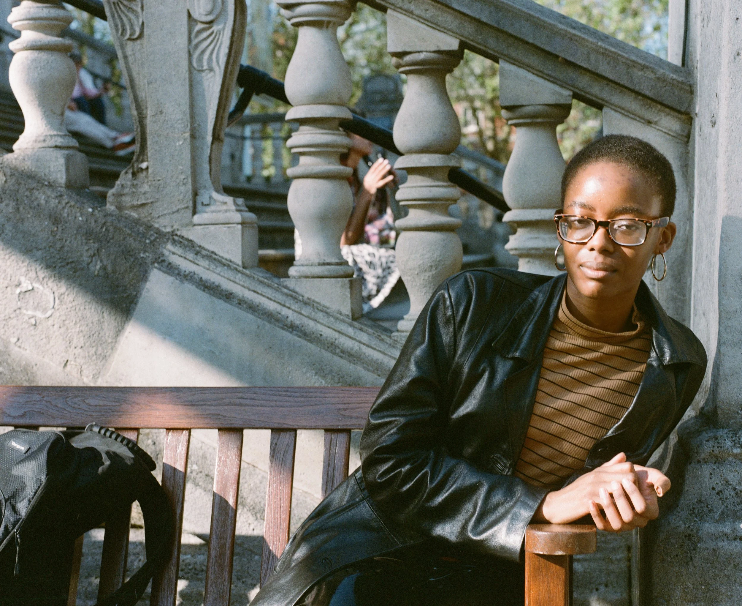 Person sitting on a bench outdoors wearing glasses, a black leather jacket, and a brown striped shirt. They are leaning against the bench with stone railing and stairs in the background.