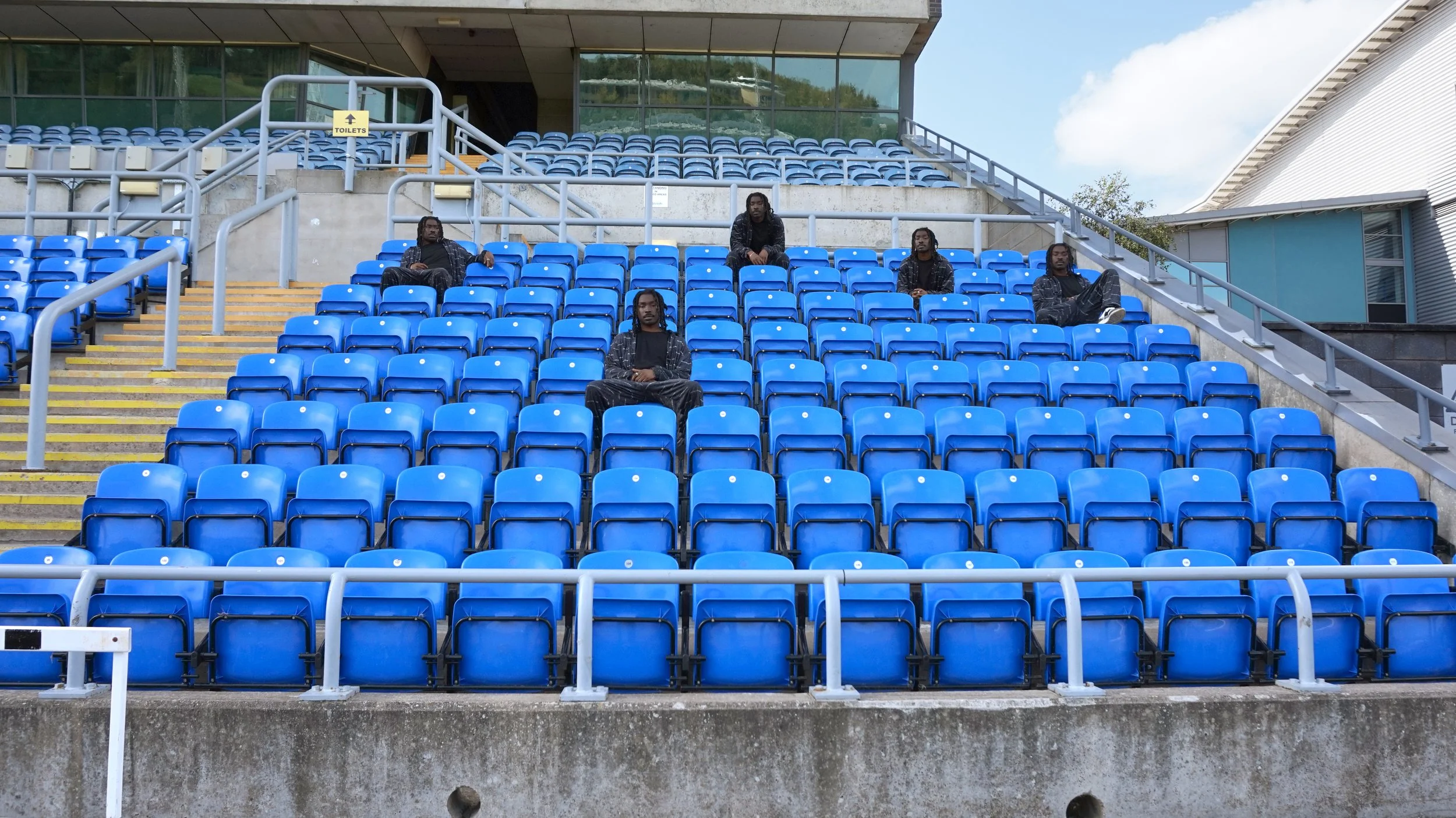 Person sitting in blue stadium seats with multiple images of the same person edited into the picture.
