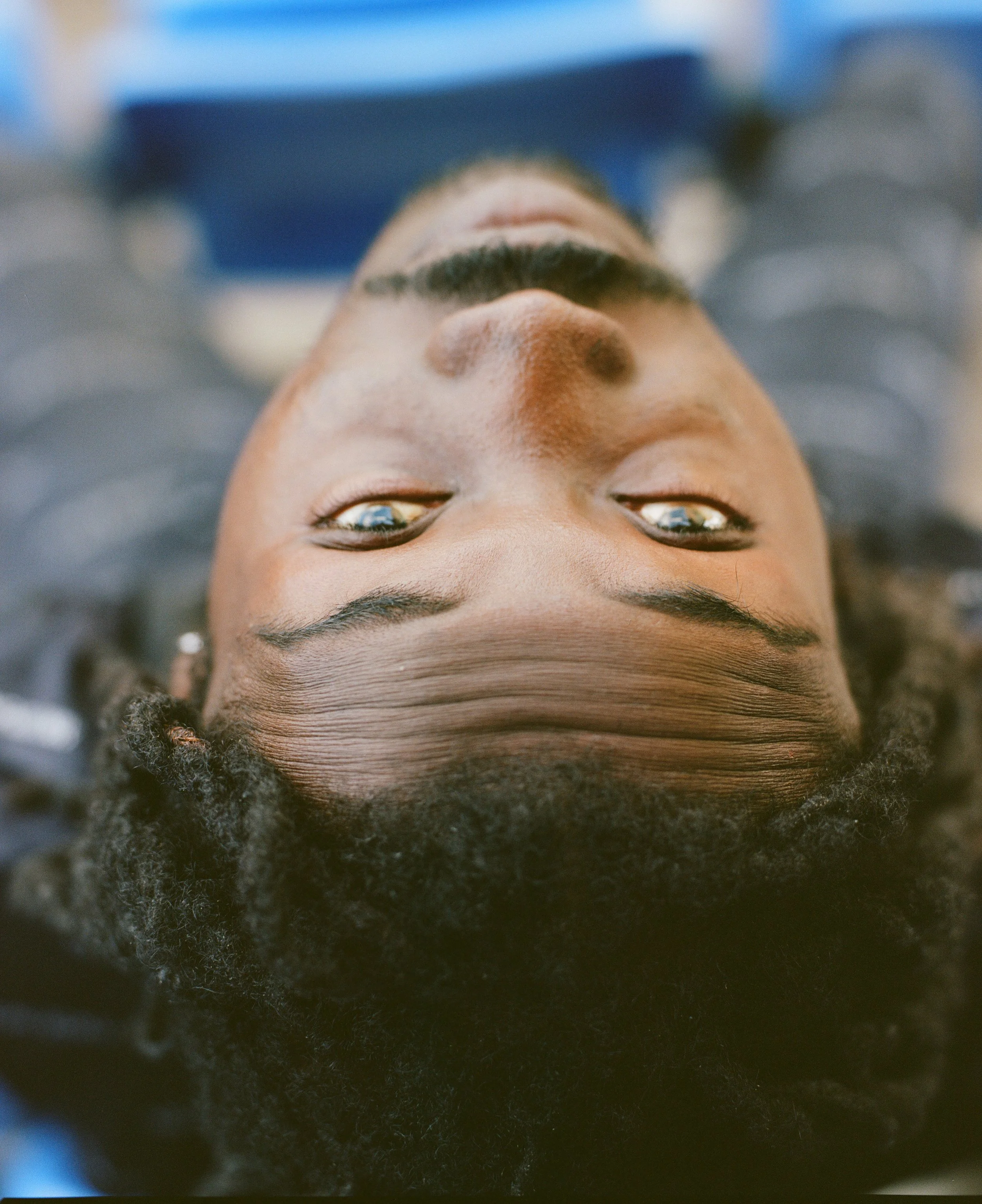 Close-up of a person with locs lying down, looking directly at the camera. The background is slightly blurred, with blue and gray tones.