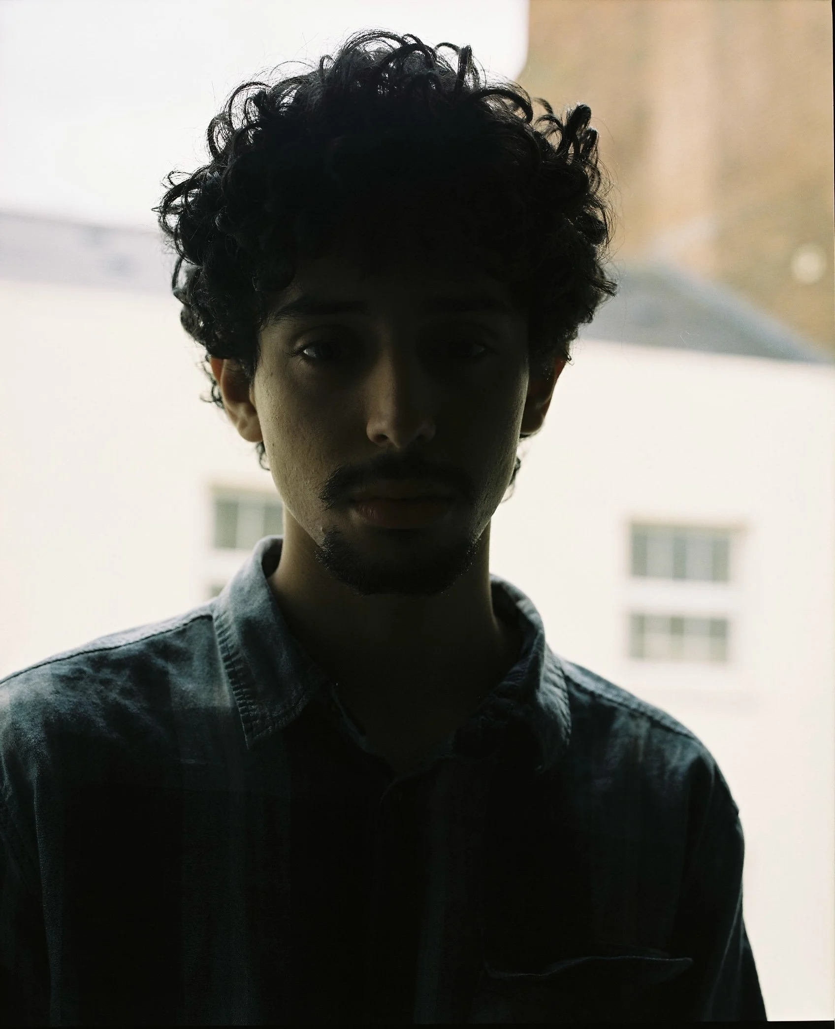 Silhouette of a man with curly hair and a beard, wearing a collared shirt, standing in front of a bright window.