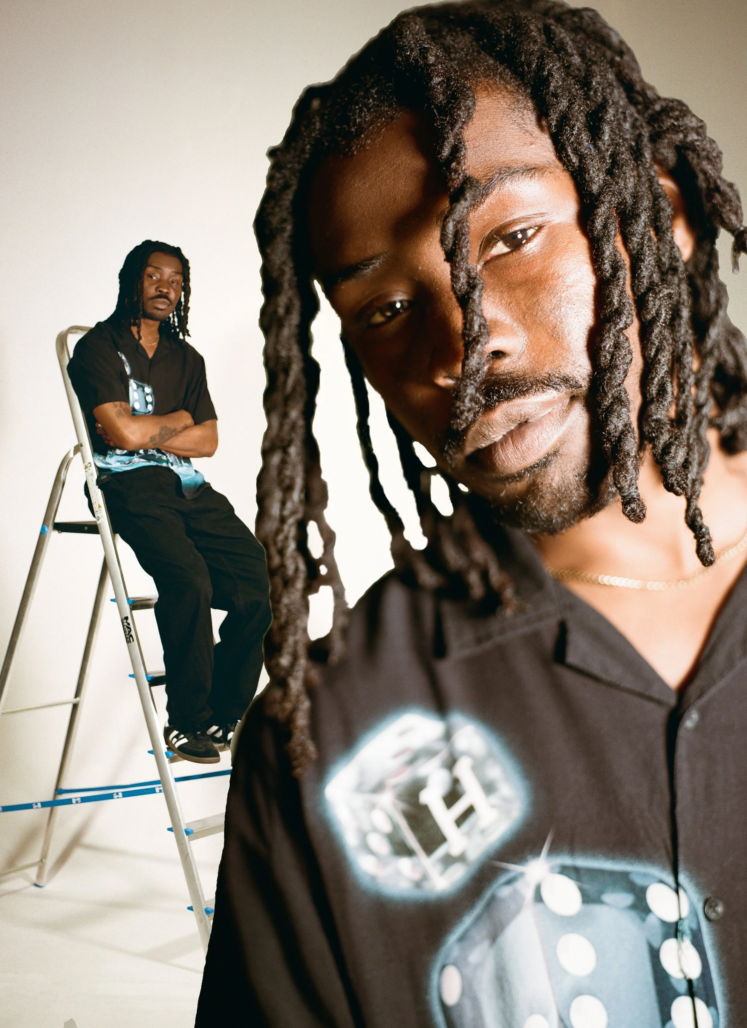 Close-up of a person in the foreground, wearing a black shirt with graphic design. In the background, another person sits on a ladder, arms crossed, also wearing a dark outfit.