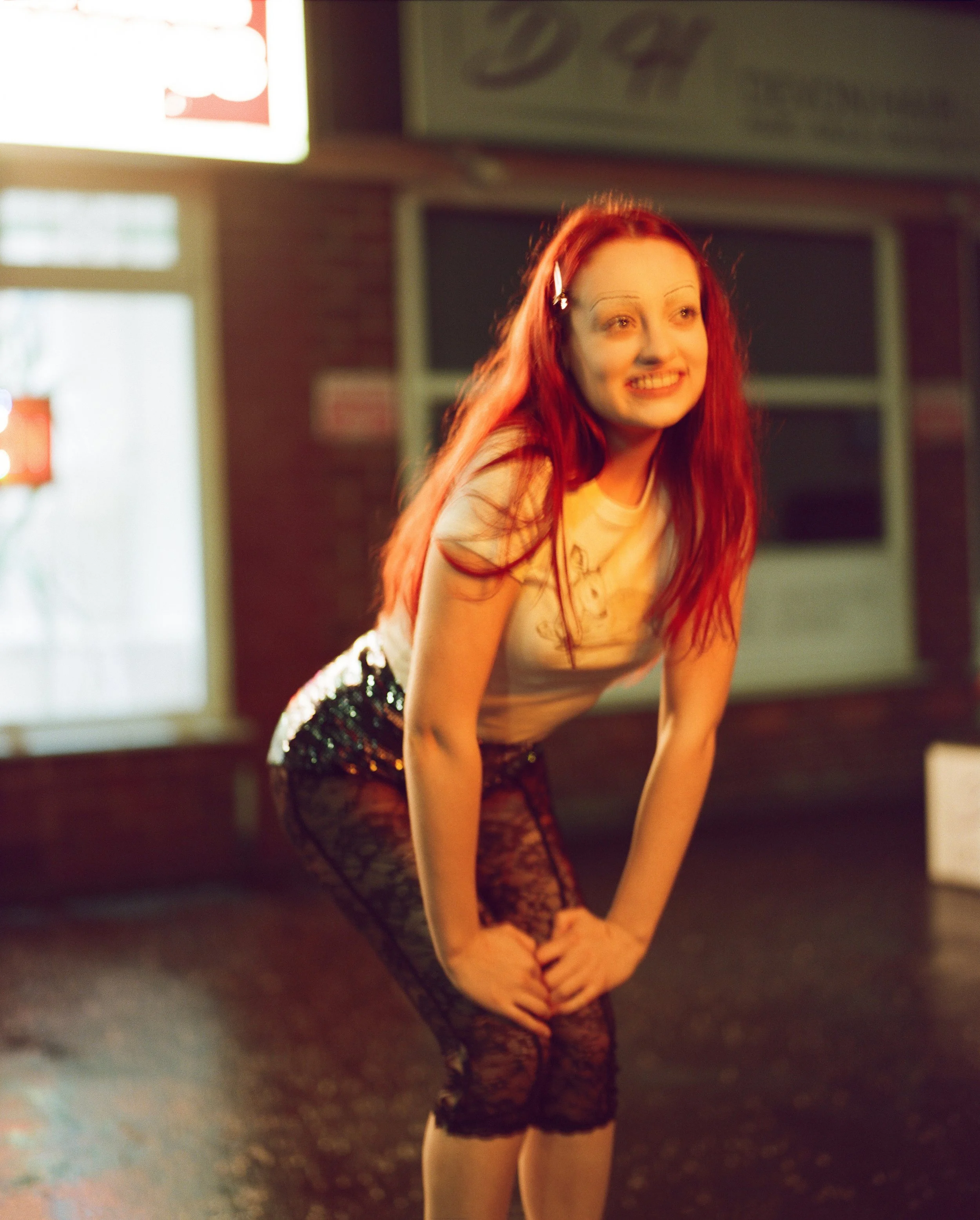 Woman with red hair smiling, wearing a white shirt and lace leggings, standing outdoors at night.